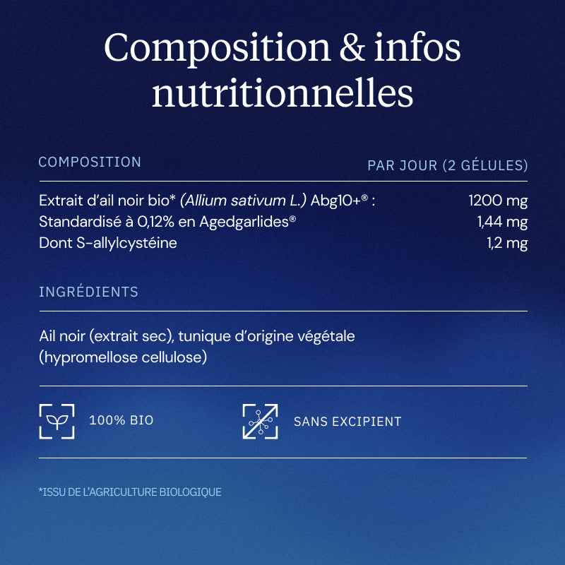 Ail noir (extrait sec), tunique d'origine végétale (hypromellose cellulose).