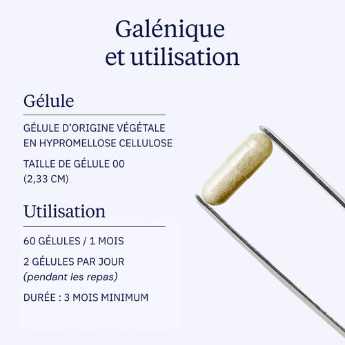 2 gélules par jour = 1 200 mg d’extrait à 0,1 % (1,2 mg de SAC).