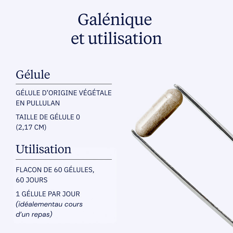 1 gélule par jour : pour entretenir la concentration et la clarté mentale. 2 gélules par jour : pour un soutien renforcé en cas de fatigue mentale ou de baisse de performance cognitive.