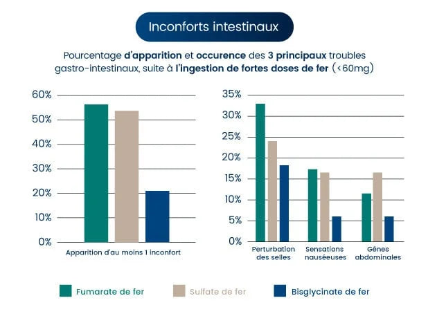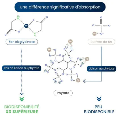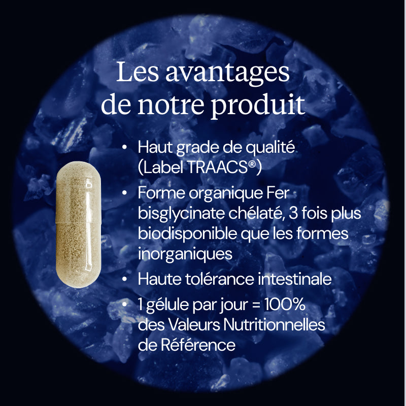 1 gélule par jour : apporte 100 % des valeurs nutritionnelles de référence (VNR) en fer selon l’EFSA. Ce dosage de bisglycinate de fer a démontré une efficacité comparable, voire supérieure, aux sels de fer classiques, tout en étant mieux toléré.