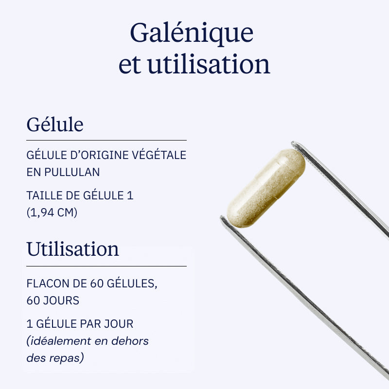 Avaler la gélule avec un grand verre d’eau à jeun. Pour une synergie beauté, associer à une alimentation riche en acides aminés soufrés et antioxydants.