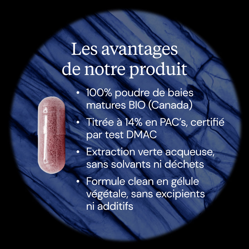 | Standardisé à 14% en Proanthocyanidines (PACs) | 56 mg |
