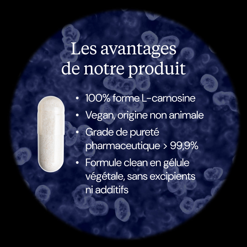 Les études sur la carnosine couvrent généralement 4 à 12 semaines. À renouveler après une pause de quelques semaines, en fonction des besoins.