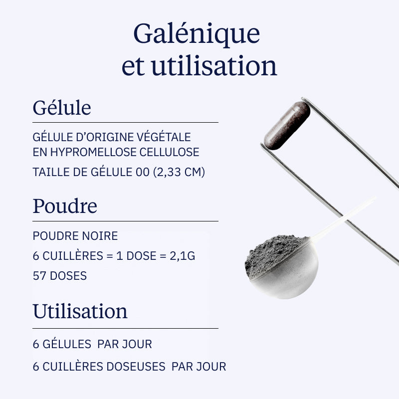 3 gélules ou cuillères doseuses avant le repas + 3 juste après : pour aider à soulager les flatulences et accompagner le confort digestif. Il est conseillé de débuter progressivement : 2 unités/jour quelques jours, puis augmentation par paliers jusqu’à la dose maximale recommandée (6 unités).