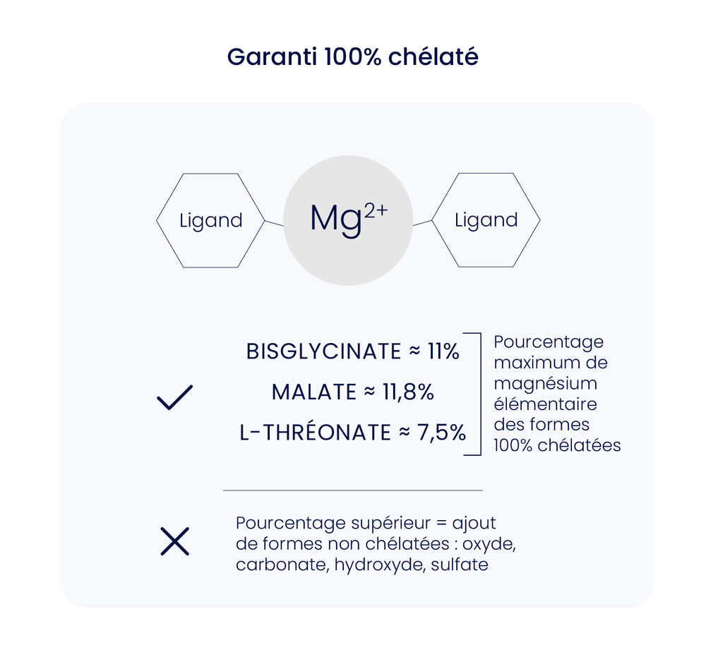 Magnésium malate, magnésium bisglycinate (TRAACS®), magnésium L-thréonate (Magtein®), TCM (triglycérides à chaîne moyenne) de coco biologique, tunique d'origine végétale (pullulan).