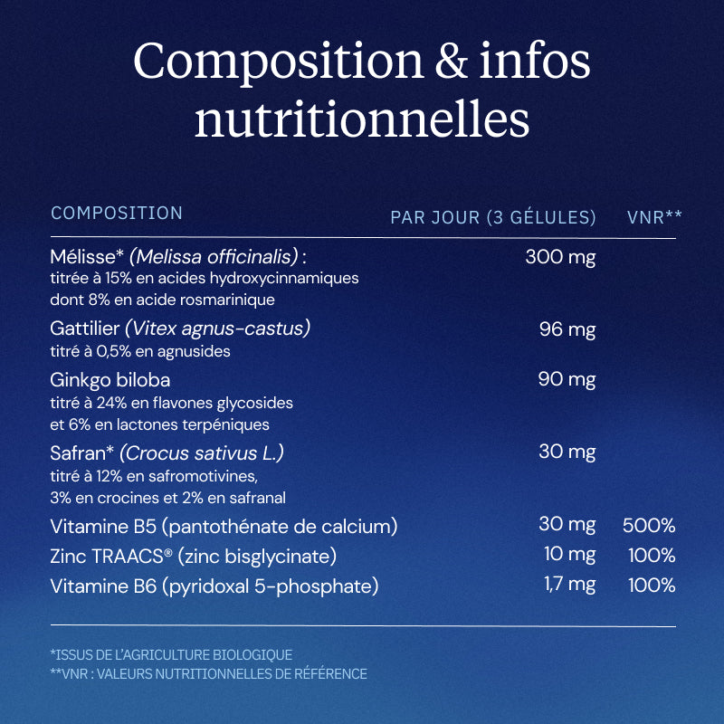 | Mélisse* (Melissa officinalis) titrée à 15% en acides hydroxycinnamiques dont 8% en acide rosmarinique | 300 mg | |