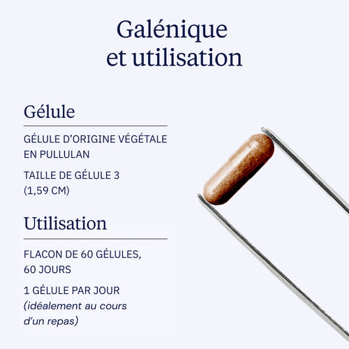 Avaler la gélule avec un grand verre d’eau pendant le repas pour une meilleure assimilation.