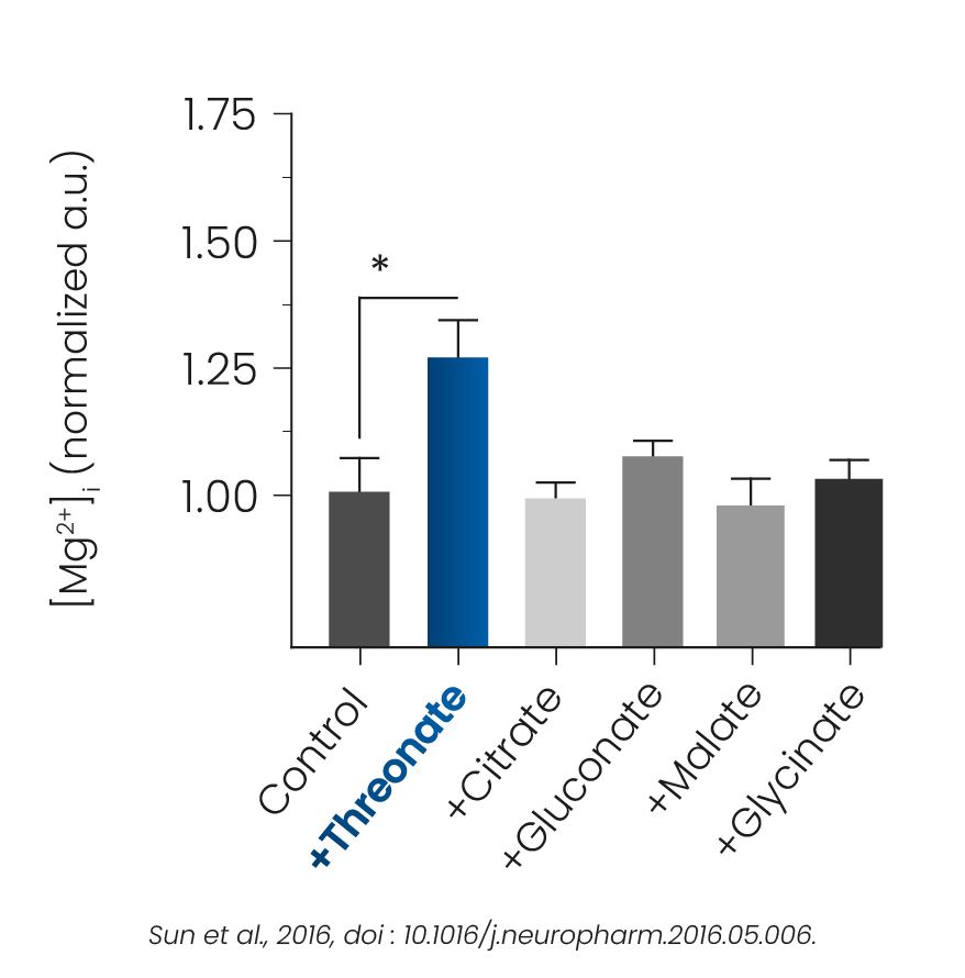 Tout d’abord, ils ont confirmé in vivo que celui-ci avait bien la capacité de traverser la barrière hémato-encéphalique, une structure protectrice qui régule l’échange de substances entre le sang et le cerveau. Le thréonate étant un dérivé de la vitamine C et du DHA, il utilise essentiellement un transporteur commun à ces deux composants : le GLUT. La présence de ce transporteur dans la barrière hémato-encéphalique permet au Magtein® d’atteindre le cerveau d’une façon particulièrement efficace et exclusive. Mais les chercheurs sont allés encore plus loin : ils ont analysé la capacité du thréonate à transporter le Magnésium au sein même des cellules neuronales (et pas juste à agir en périphérie du cerveau). Puis, ils ont comparé cette propriété avec d’autres formes comme le glycinate, malate ou citrate. Seul le thréonate a été capable d’augmenter efficacement la teneur en Magnésium dans les neurones, toujours via les transporteurs GLUTs.