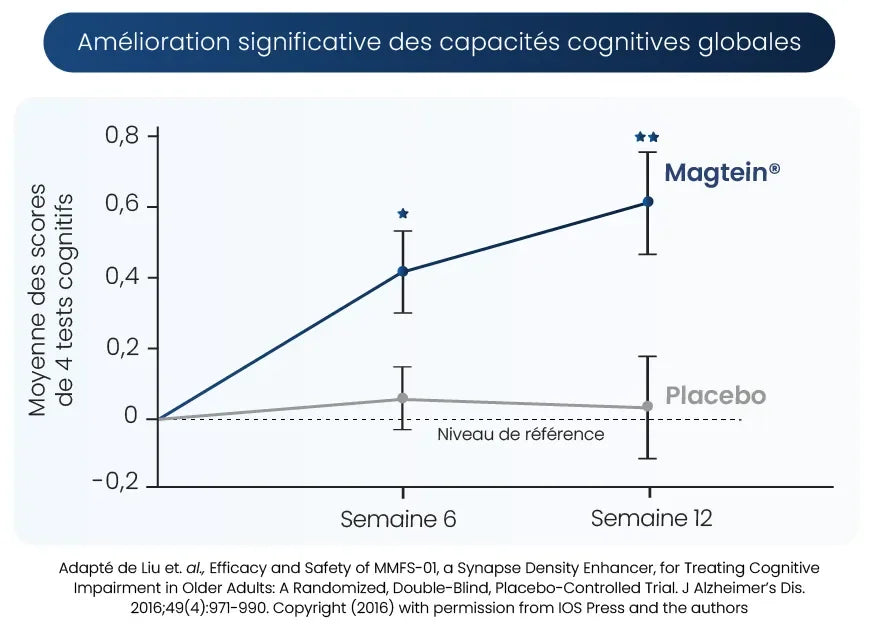 Suite à la démonstration de ses effets sur le système nerveux et de par sa haute assimilation cérébrale, le Magtein® a fait l’objet d’études cliniques robustes. Il a notamment été testé dans le cadre d'un essai clinique randomisé, en double aveugle et contrôlé par placebo, sur 51 sujets âgés de 50 à 70 ans. Les personnes ayant pris le produit contenant le Magnésium L-Thréonate, à une dose de 2 g/jour, ont montré des améliorations significatives de leurs capacités cognitives globales par rapport au placebo. Les résultats sont exprimés en score de la fonction cérébrale basé sur la mémoire (capacités d’apprendre et de mémorisation), l’attention et la fonction exécutive (capacités de prise de décision et de planification) de l’individu.