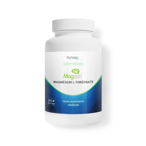 À la différence des autres sels de magnésium présents sur le marché, le Magnésium L-Thréonate est véritablement LA forme idéale pour le cerveau. Après son succès sur le marché américain, Dynveo est fier d'être la première société française à vous présenter ce magnésium breveté de nouvelle génération : le Magtein®. Nous vous proposons un Magnésium L-Thréonate pur, avec uniquement un extrait d'huile de coco biologique comme agent de charge naturel, sans aucun additifs controversés, dans des gélules 100% végétales.