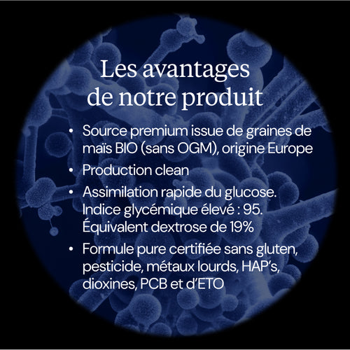 (dextroseequivalent) : niveau maximal pour une maltodextrine, garantissant une excellente digestibilité et une assimilation rapide des glucides ¹