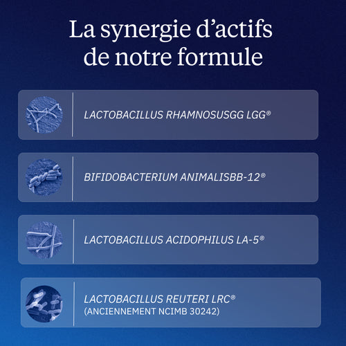 Les études utilisant les souches LGG®, LA-5®, BB-12® ou LRC® durent généralement 2 à 8 semaines, selon les objectifs microbiotiques et la colonisation recherchée. À renouveler après une pause de quelques semaines, en fonction des besoins.