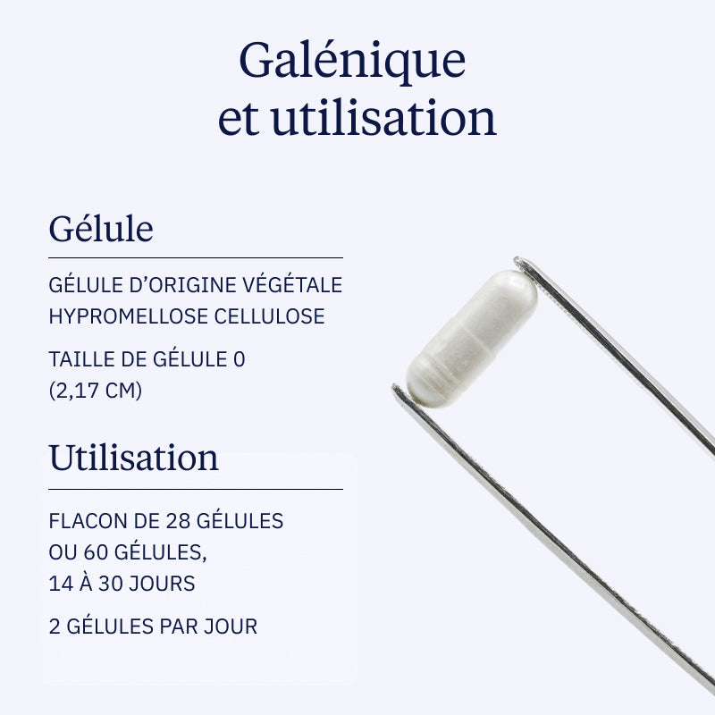2 gélules par jour, pour soutenir l’équilibre du microbiote intestinal et favoriser l’implantation des souches physiologiques.