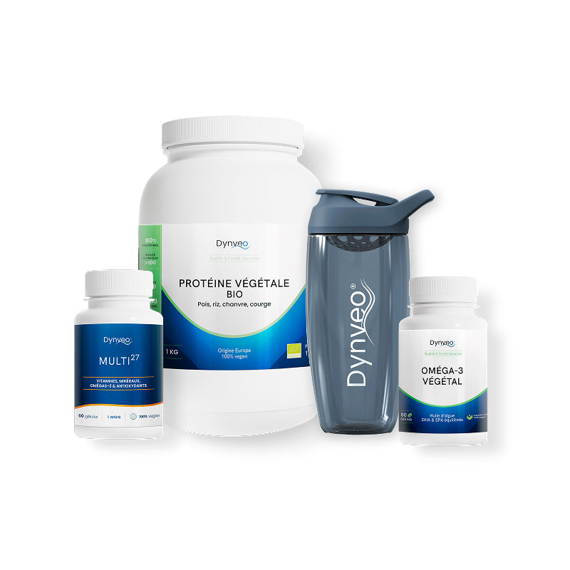 - Protéine végétale Bio : 2 cuillères doseuses de 30 ml (équivalent à 30 g) par jour. - Complexe Multi27 : 2 gélules par jour. - Oméga-3 végétal : 1 capsules végétales par jour.