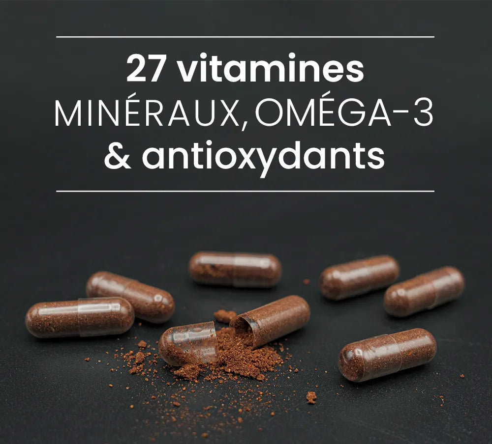 | Pour 100 g de poudre de protéine végétale Bio, 2 gélules végétales de Multi27 et 2 capsules végétales d’oméga-3 | ||