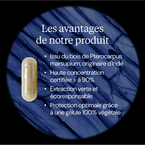 Fibres d’acacia biologique, Pterocarpus marsupium Roxb. (extrait sec), gélule d'origine végétale (pullulan).