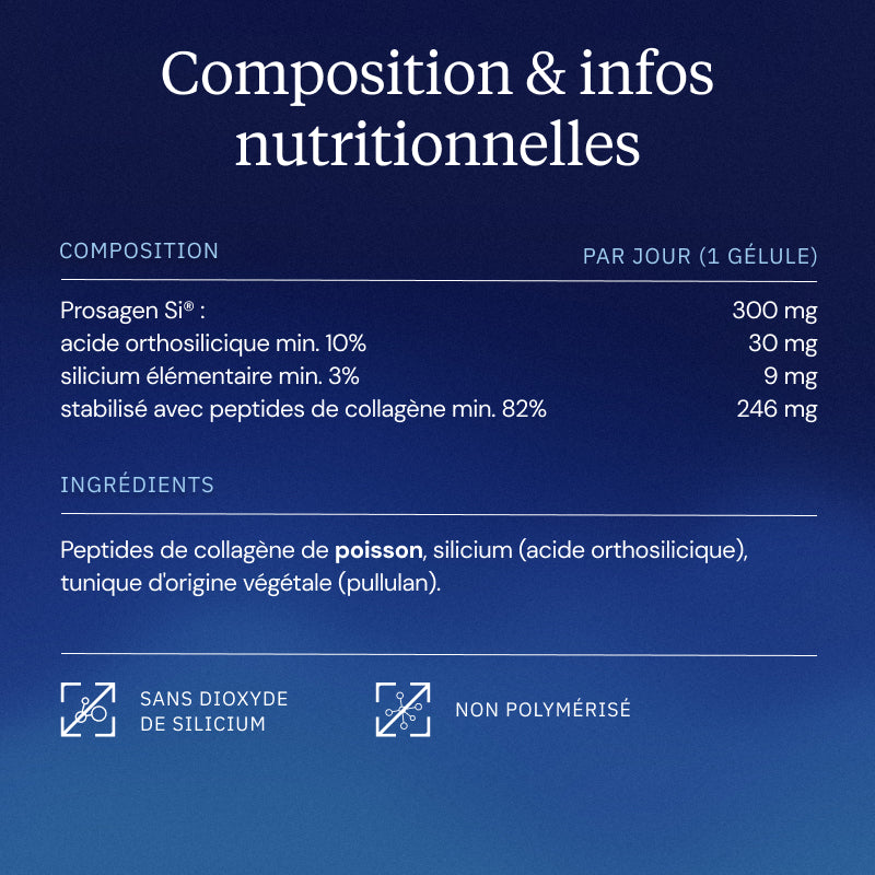 Peptides de collagène de poisson, silicium (acide orthosilicique), tunique d'origine végétale (pullulan)