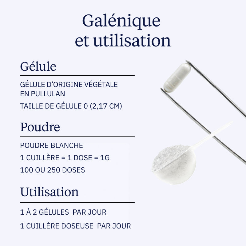 Ne pas dépasser la dose journalière recommandée. Les compléments alimentaires ne peuvent être utilisés comme substituts d'un régime alimentaire varié. Tenir hors de portée des enfants. Pour le format poudre, une cuillère doseuse est fournie à l'intérieur de ce flacon. Après ouverture du format poudre, conserver au réfrigérateur (2-8°C). Pour le format gélule, conserver dans un endroit frais et sec.