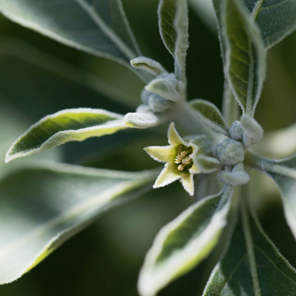L’ashwagandha (Withania somnifera) est originaire d’Inde et d’Afrique du Nord. Ce petit arbuste aux fleurs jaunes est surtout réputé pour sa racine, traditionnellement utilisée pour renforcer la résistance au stress, améliorer la vitalité et soutenir l’équilibre hormonal. Ses feuilles contiennent également des composés actifs mais dans des proportions différentes.
