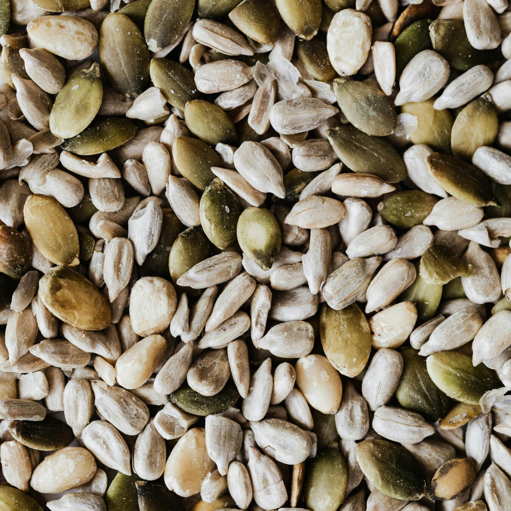 Graines : lin, sésame, tournesol, pavot, courge, chia, chanvre, pignons de pin.