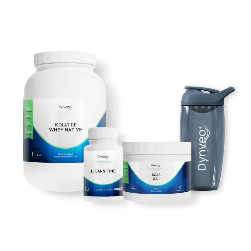 Un shaker offertRetrouvez les bienfaits de la Whey native isolate, des BCAA 2.1.1 et de la L-Carnitine agissant en synergie pour favoriser la sèche musculaire. Dans ce pack, nous vous offrons un shaker Dynveo premium de 700 ml garanti sans odeur et sans fuite.La Whey native isolate, contenant 95% de protéines, contribue à l’augmentation de la masse musculaire. Les BCAA 2.1.1, composés uniquement de L-leucine, L-isoleucine et L-valine, sont des acides aminés essentiels pour maximiser les performances sportives. La L-carnitine est utilisée pendant les entraînements mais également dans les phases de récupération sportive.Contenu du pack1 x Whey native isolate 1 kg1 x BCAA 2.1.1 200 g1 x L-carnitine 500 mg / 60 gélules1 x Shaker Dynveo 700 ml*Pack réservé aux particuliers.Voir en détail