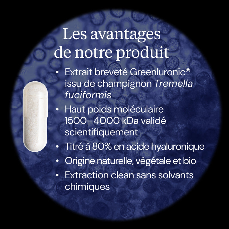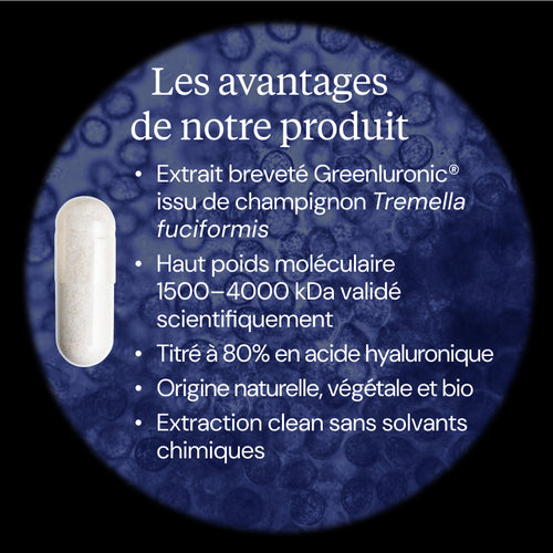 Dynveo est fier de vous proposer GreenIuronic®, le premier acide hyaluronique d’origine naturelle et biologique. En effet, la très grande majorité des produits présents sur le marché sont une forme synthétique, alors que notre complément alimentaire est extrait à partir du champignon bioTremella fuciformis. De plus, il possède un haut poids moléculaire(1500-4000 kDa), afin de favoriser son assimilation et de compenser la diminution de la taille de l’acide hyaluronique de l’organisme quand on avance en âge. Notre Acide hyaluronique BIO GreenIuronic® est la solution naturelle pour prendre soin de sa peau (fermeté, élasticité, hydratation) avec seulement une gélule par jour.