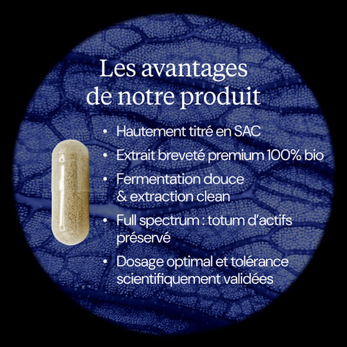 2 gélules par jour = 1 200 mg d’extrait à 0,1 % (1,2 mg de SAC).
