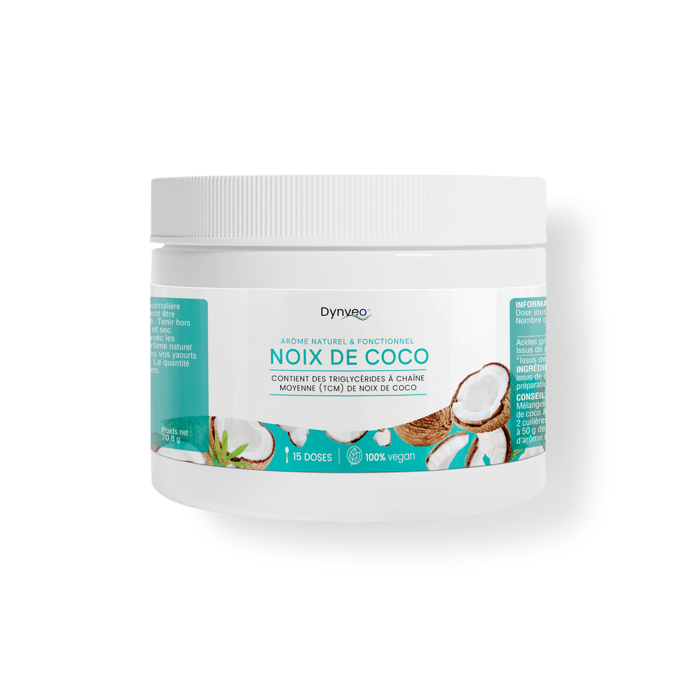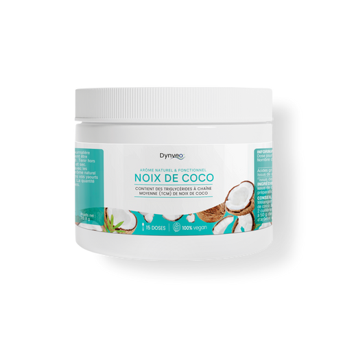 Arôme naturel de noix de coco : TCM (triglycérides à chaîne moyenne) biologiques issus de coco, arôme naturel de noix de coco : mélange de préparations et de substances aromatisantes naturelles.