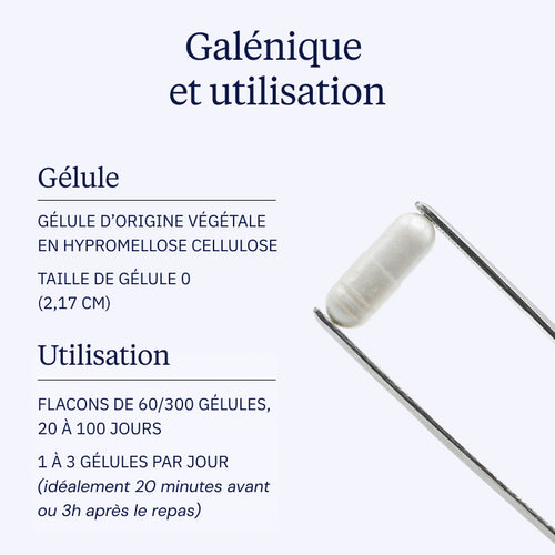 A prendre pendant 1 mois, à renouveler après une pause d'une semaine, selon les besoins. La littérature scientifique observe les effets en quelques jours.