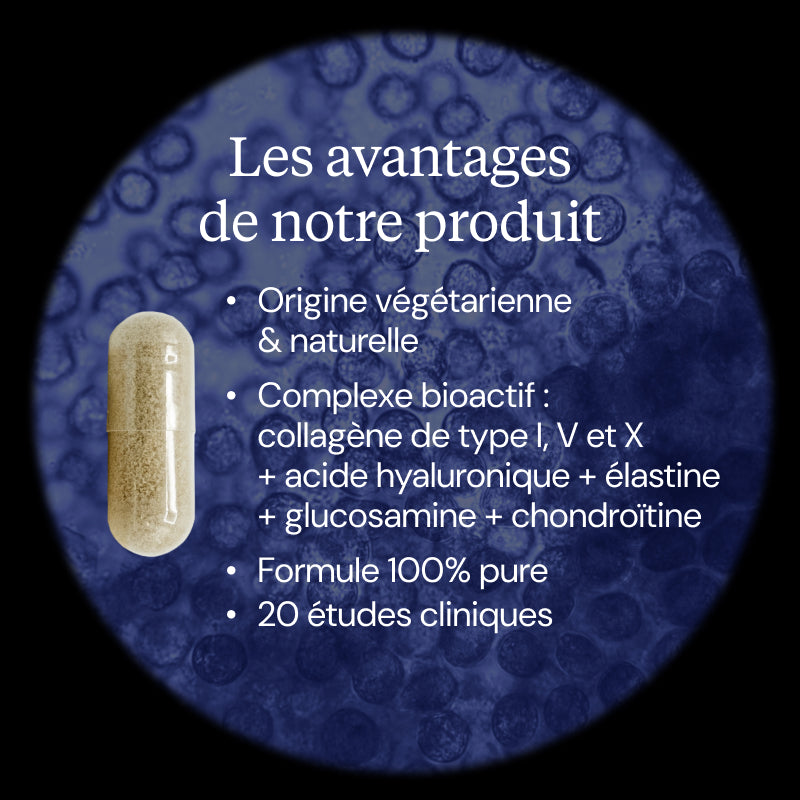 1 gélule par jour : pour un apport protéique contribuant au maintien des structures articulaires.