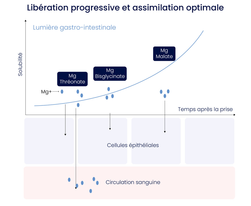 Magnésium malate, magnésium bisglycinate (TRAACS®), magnésium L-thréonate (Magtein®),