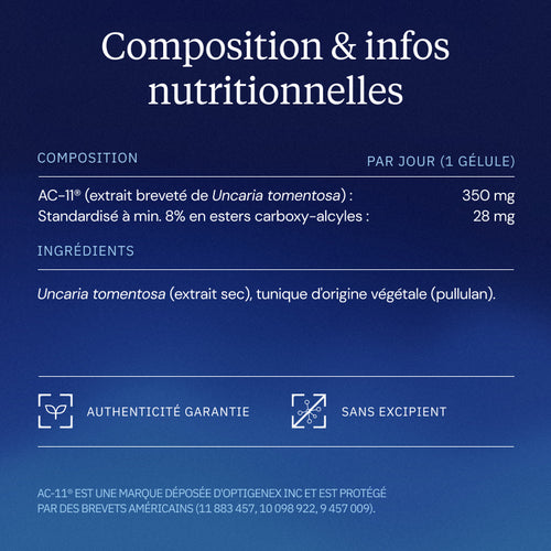 | AC-11® (extrait breveté de Uncaria tomentosa) | 350 mg |