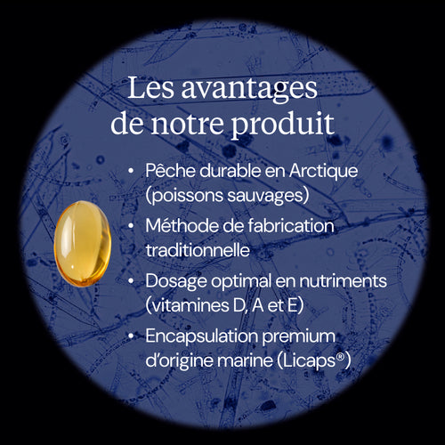 Huile de foie de morue pure, tunique : gélatine d’origine marine (poissons), eau purifiée, glycérine origine végétale.