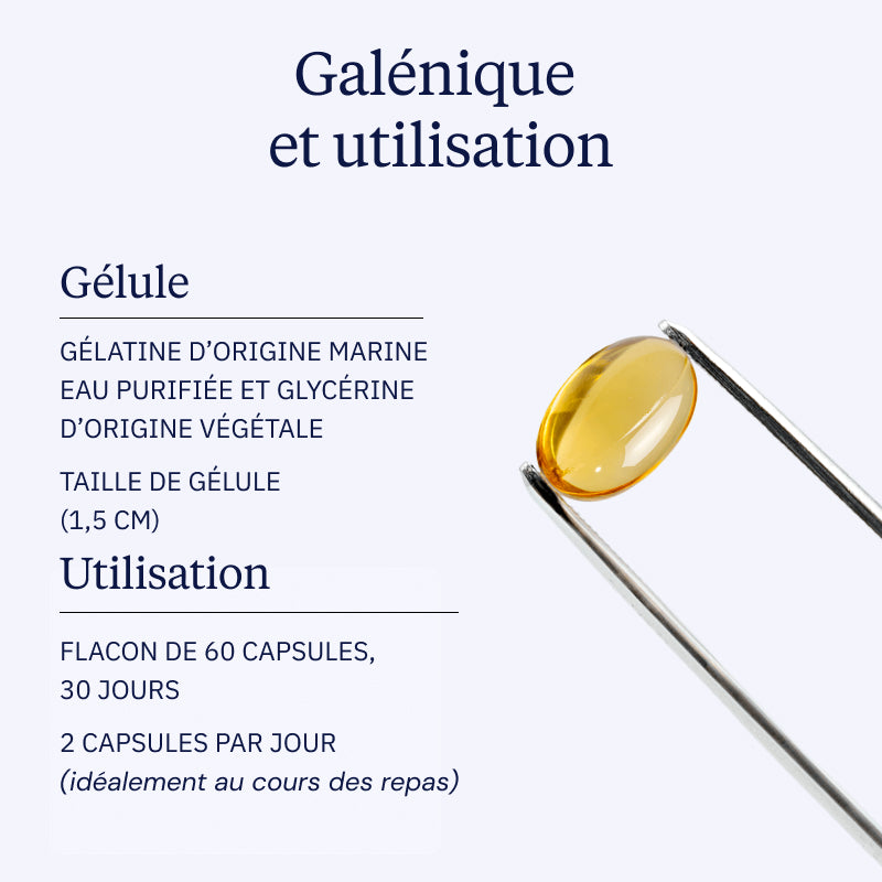 Effets observés après 8 à 24 semaines de supplémentation continue. À renouveler après une pause de quelques semaines, selon les besoins.