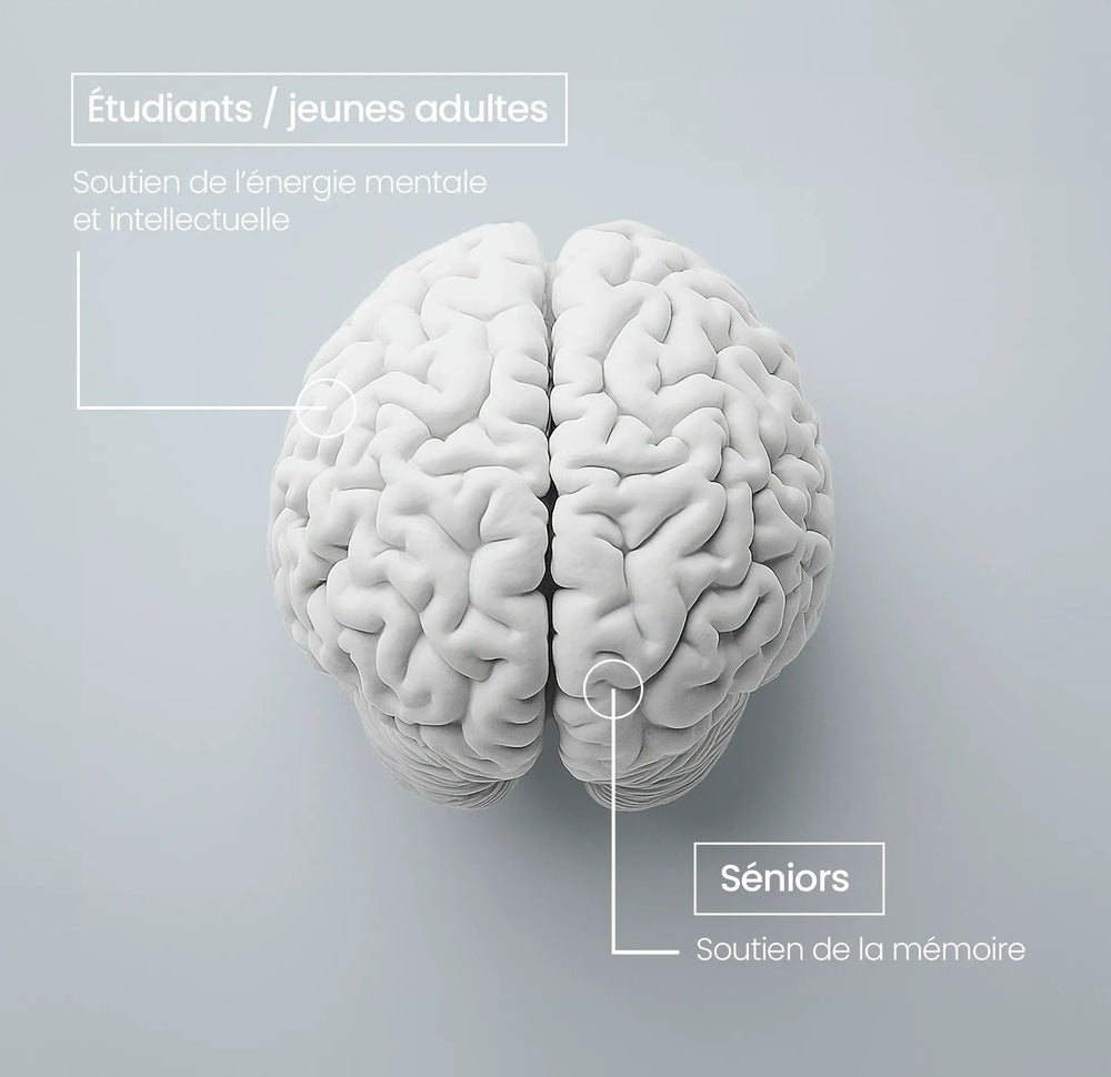 Elle est particulièrement recommandée pour : - les étudiants ou personnes actives souhaitant rester focus et efficaces mentalement, - les séniors souhaitant maintenir leur clarté d’esprit et leur vivacité cognitive, - toute personne désireuse de soutenir ses facultés mentales au quotidien : apprentissage, mémorisation, attention et réactivité intellectuelle.