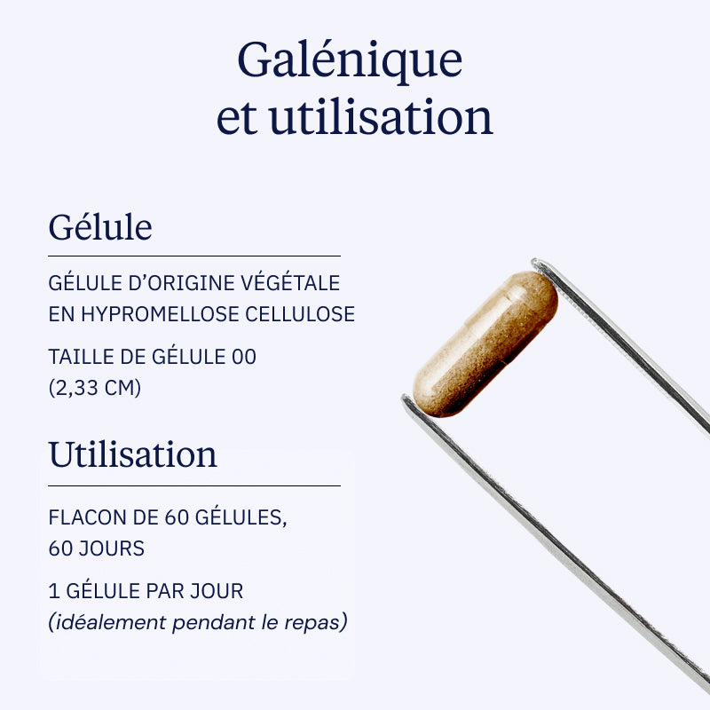 Les effets sont observés après 8 à 12 semaines de supplémentation continue. À renouveler après une pause de quelques semaines, selon les besoins.