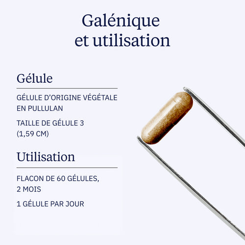 1 gélule par jour : pour contribuer au maintien d’une peau normale et à la synthèse des protéines kératiniques, grâce à la présence d’iode.