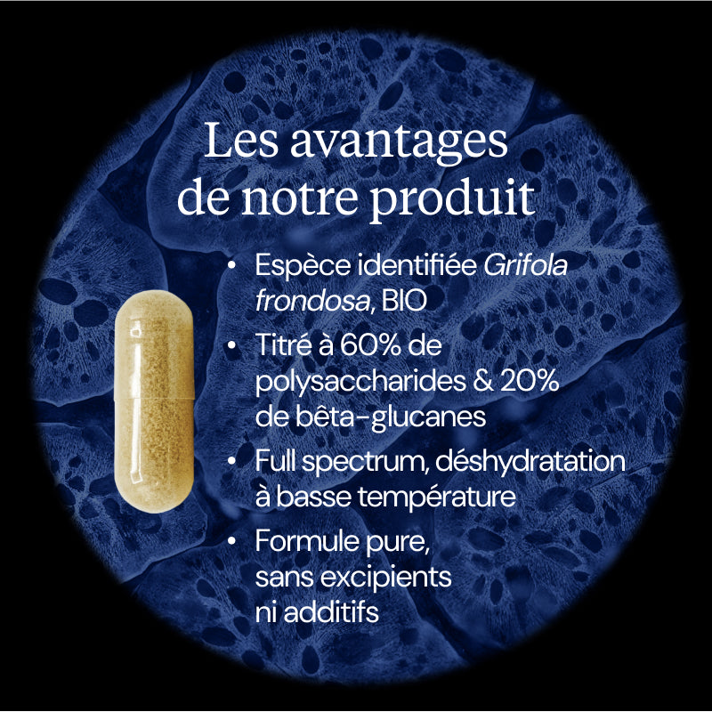 | Extrait sec de Maitaké BIO* (Grifola frondosa) | 1500 mg |