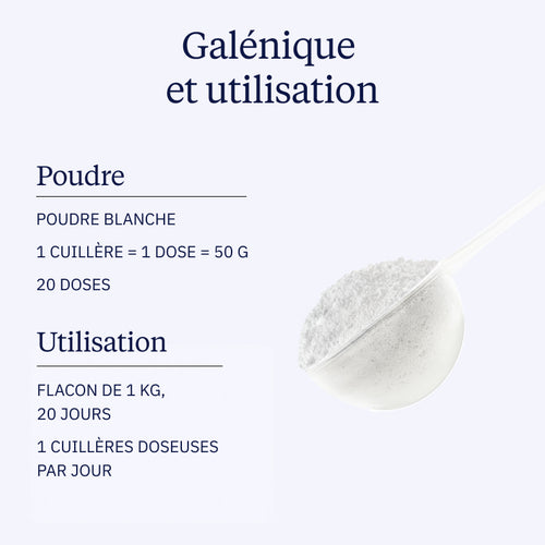 1 cuillère doseuse bombée de 70 ml (environ 50 g) par jour,.