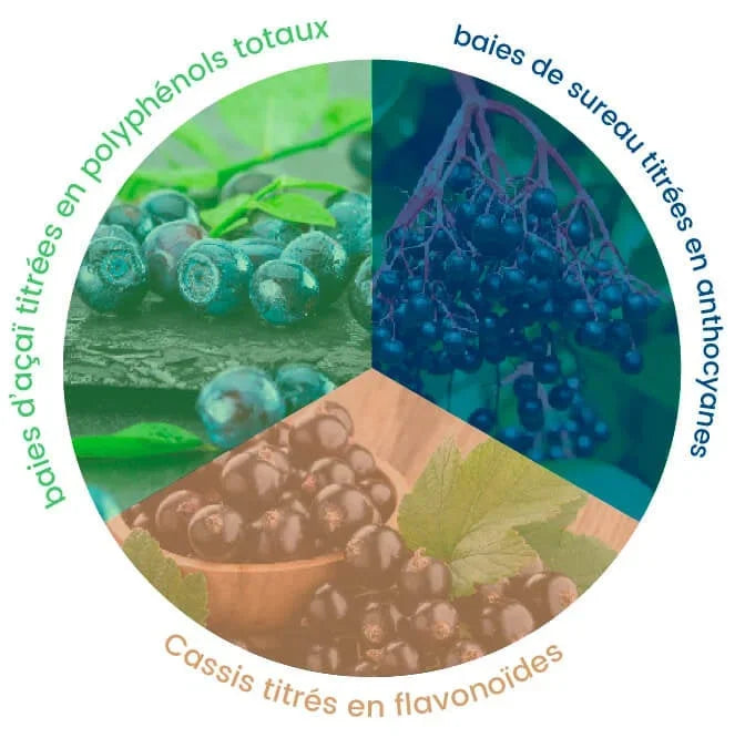 | Baies de sureau (Sambucus nigra L.) titrées à 15% en anthocyanines | 50 mg | |
