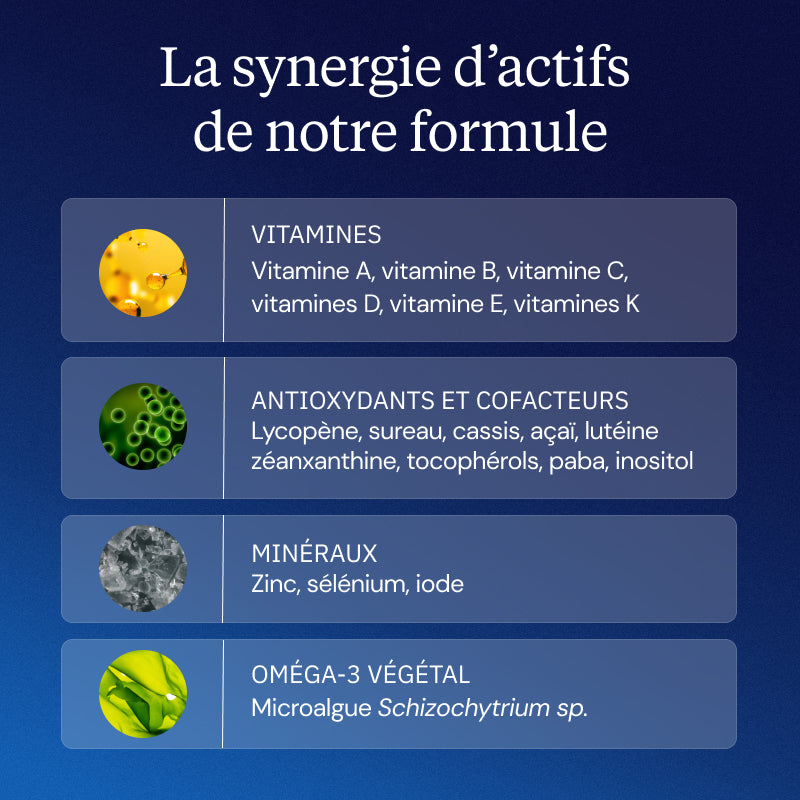 Idéal pour les personnes souhaitant retrouver tonus, concentration et endurance au quotidien, notamment : - les actifs surmenés ou soumis à un rythme soutenu, - les personnes fatiguées, stressées ou carencées en micronutriments, - les seniors souhaitant maintenir leur vitalité et leurs fonctions cognitives, - les sportifs en quête d’une meilleure récupération et d’un soutien métabolique.