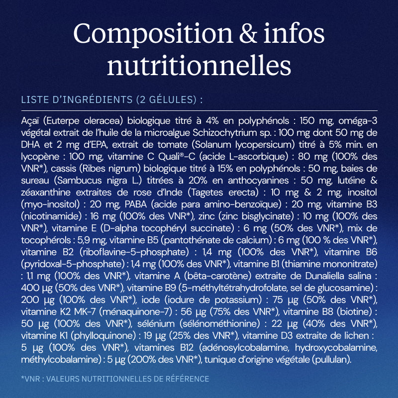 | Vitamine A (bêta-carotène) extraite de Dunaliella salina | 400 µg | 50% |