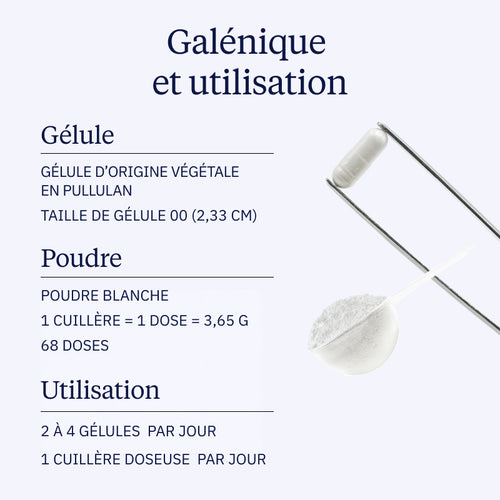 2 gélules le matin et 2 le soir pour une action continue. Ou 12 cuillère dose matin et soir. Les sportifs peuvent privilégier la prise avant l’effort pour préparer l’organisme, ou après l’entraînement pour soutenir l'aider à récupérer.