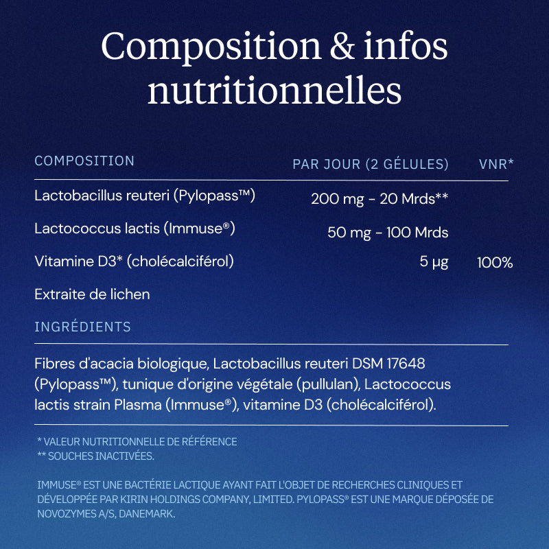 2 gélules par jour, pour soutenir l’équilibre du microbiote intestinal et favoriser l’implantation des souches physiologiques.