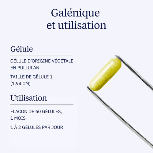 2 gélules par jour. Pour une biodisponibilité optimale, prendre pendant les repas, les graisses alimentaires facilitant l’absorption de cette molécule lipophile.