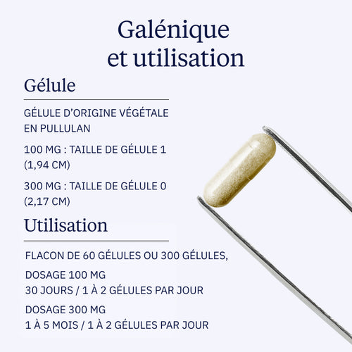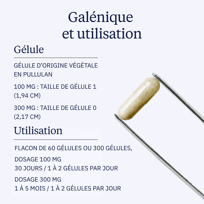 En entretien: 1 à 2 gélules de 100 mg par jour (100 à 200 mg). En soutien actif: 2 gélules de 300 mg par jour (600 mg au total).
