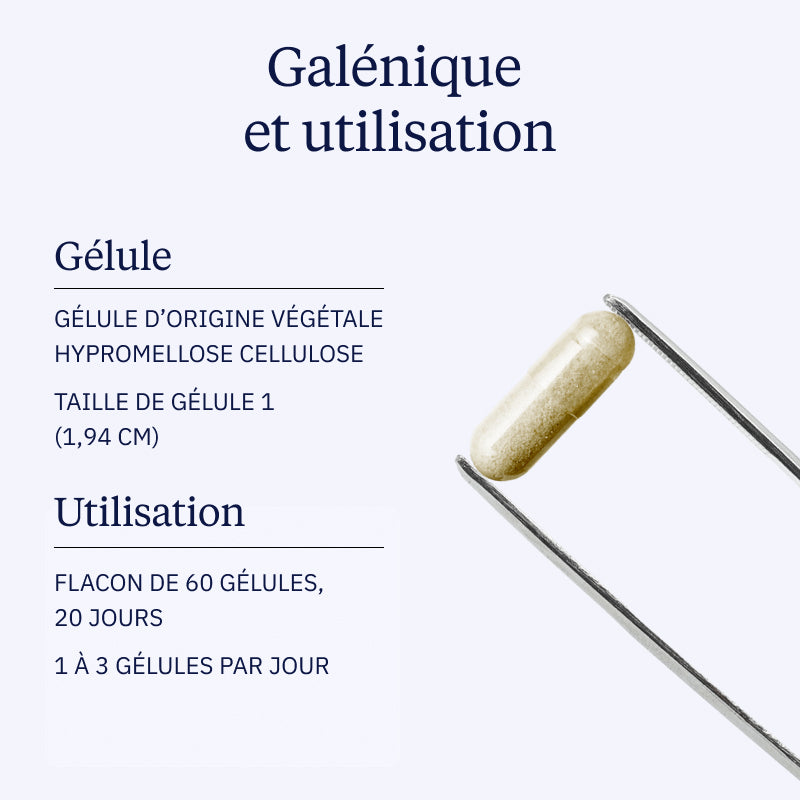 1 à 3 gélules par jour (500 à 1500 mg) : selon le besoin, en accompagnement d’un mode de vie équilibré.