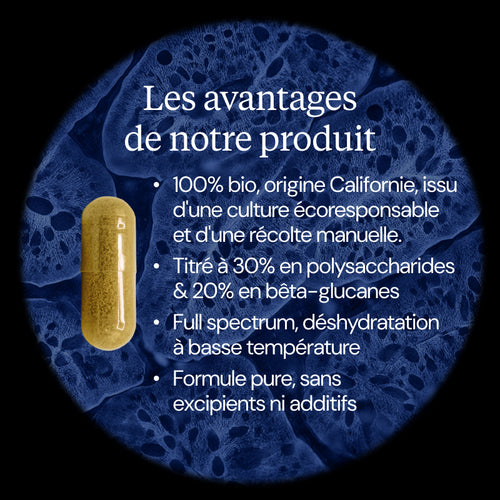 1 gélule par jour (≈ 500 mg) : pour un soutien de fond à long terme sur la vitalité et l’équilibre immunitaire. 3 gélules par jour (≈ 1500 mg d’extrait de Shiitaké BIO) : pour une action renforcée sur le système immunitaire.