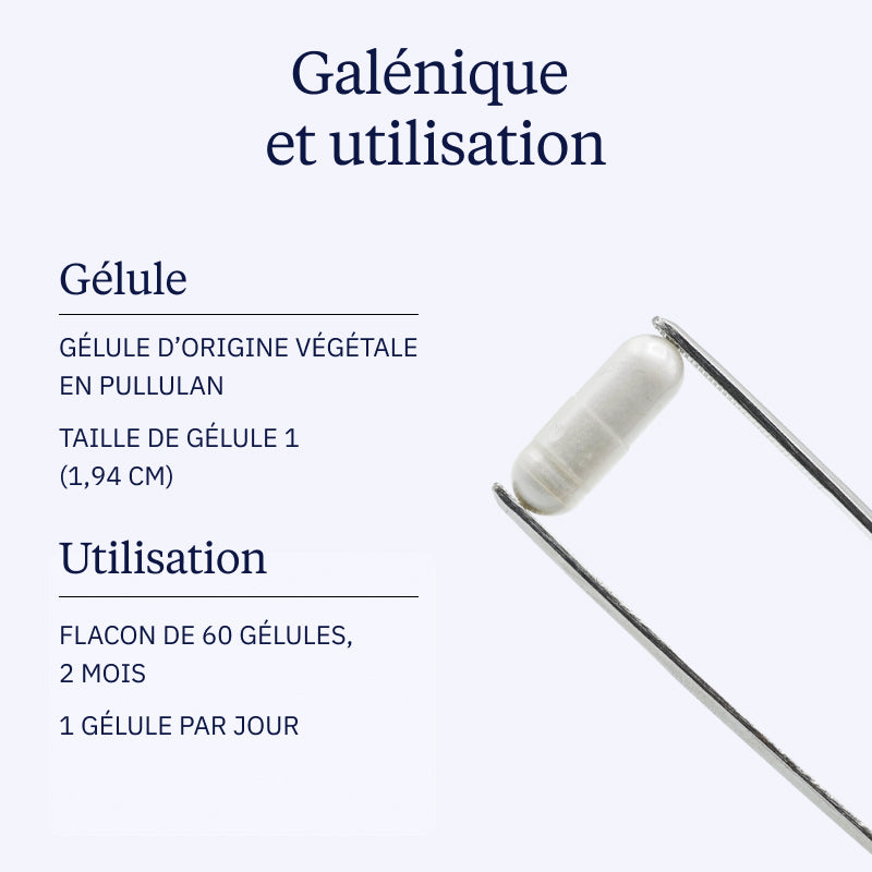 1 gélule par jour, de préférence à distance des repas pour maximiser l’absorption.